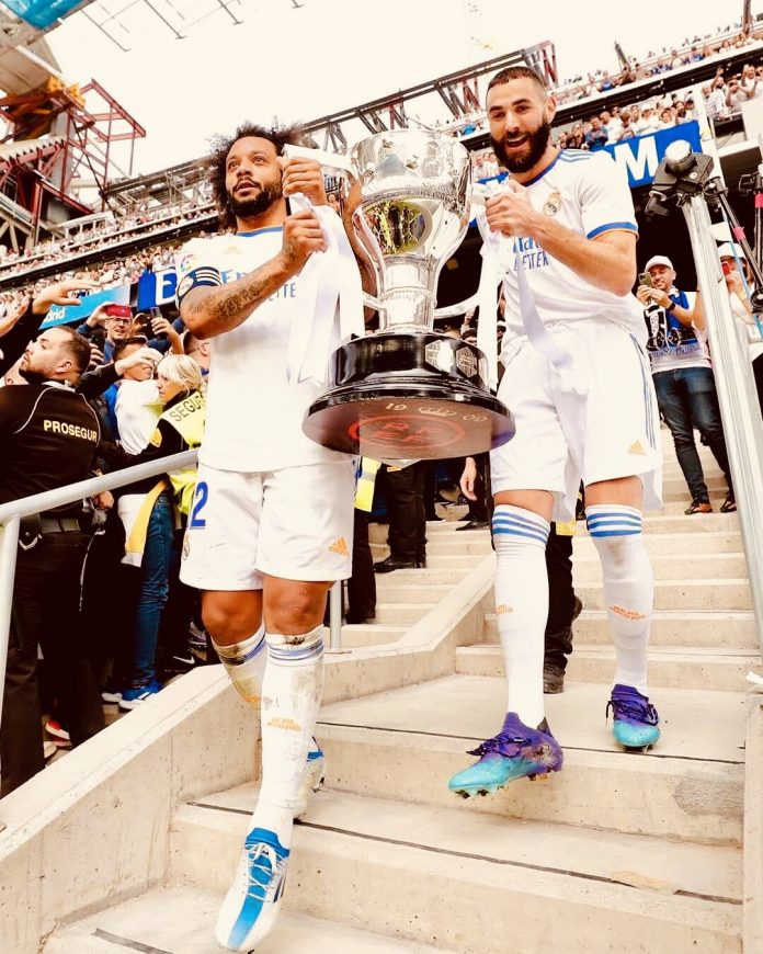 Madrid’s stars, Brazil’s Marcelo and France’s Benzema celebrate club’s victory on Saturday