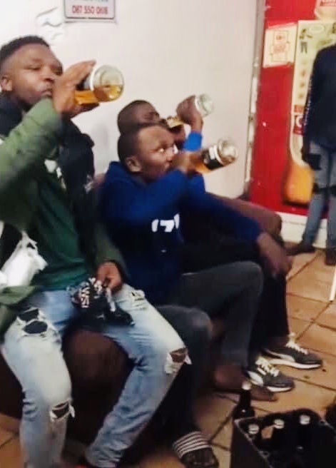 It shows the moment the alcohol thieves were busy drinking from the liquor bottles in compliance with the shop owner’s directive.